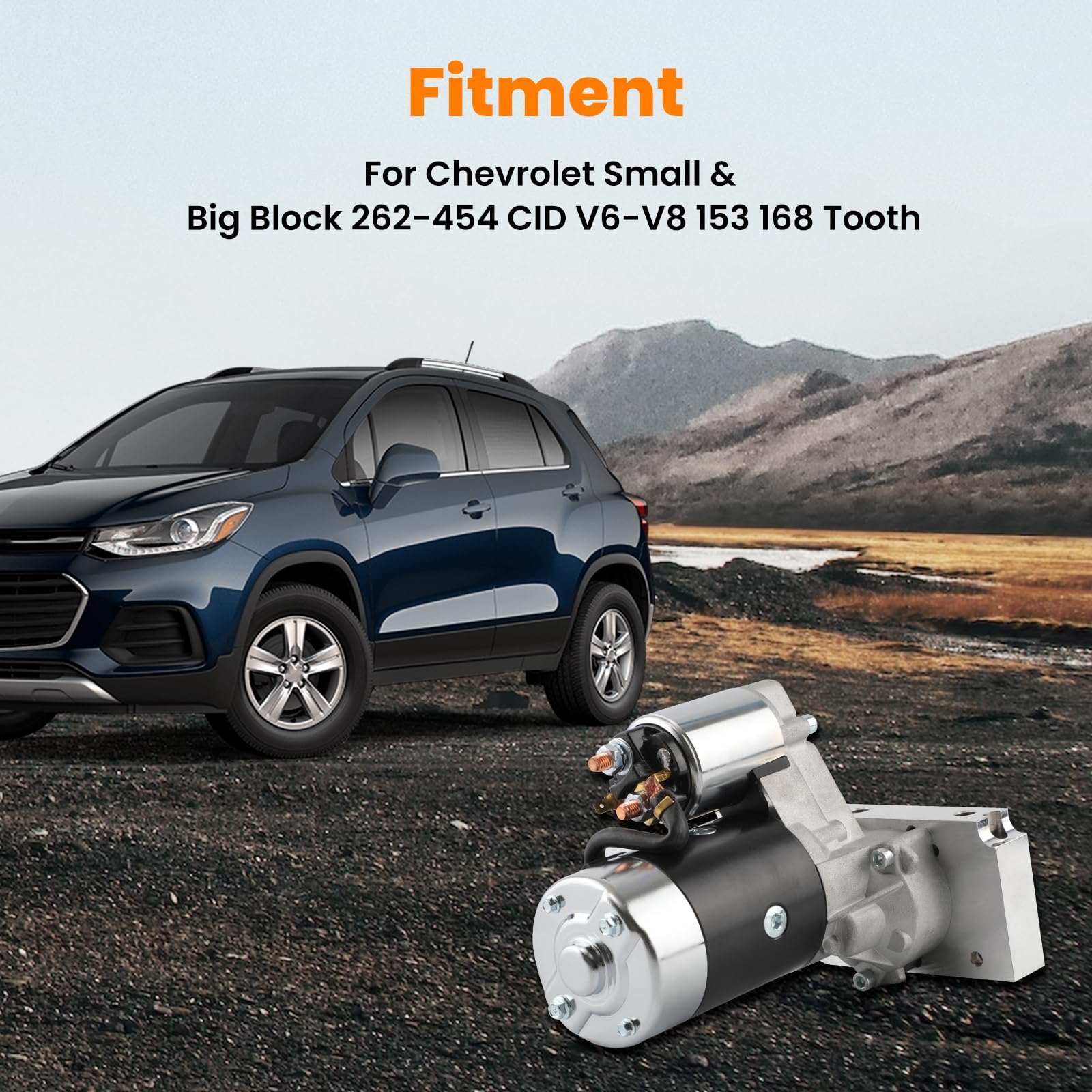 - Application: This high torque starter fits for Small Block Chevy (SBC) & Big Block Chevy (BBC) 262 265 267 283 305 307 327 350 396 402 427 454 454 CID V8 V6 with A/T& M/T with 153 or 168 Tooth Ring Gear (up to 18:1 Compression Ratio)