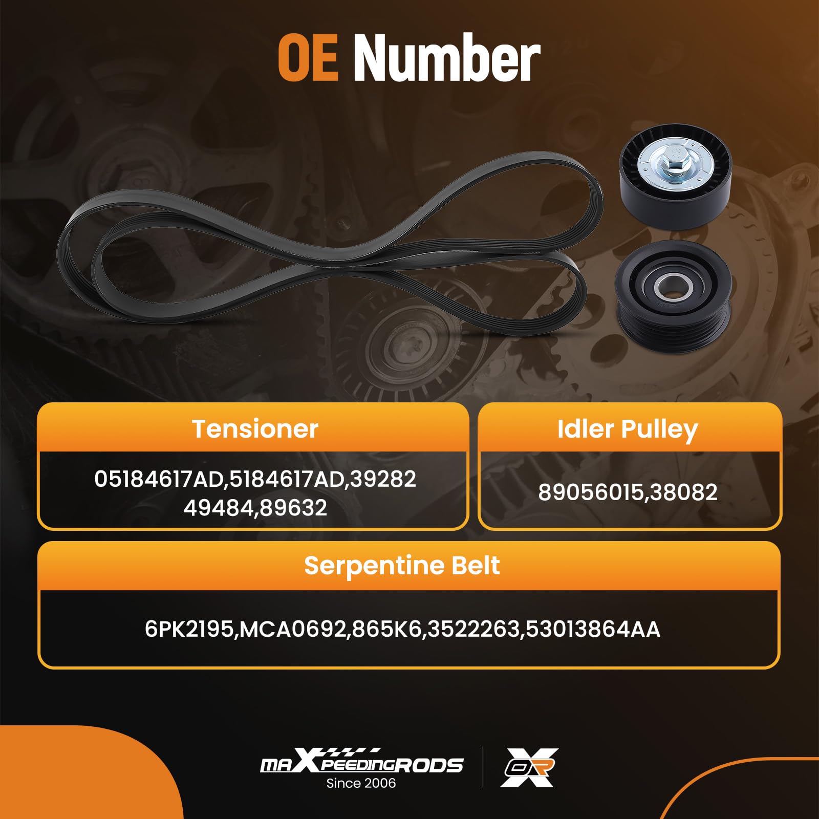 - OE Part Numbers: Drive Belt Tensioner: 05184617AD, 5184617AD,39282, 49484, 89632; Idler Pulley:89056015,38082; Serpentine Belt:6PK2195, MCA0692, 865K6, 3522263, 53013864AA, 1L5E8620CB, MOCAESP3724, 12569376, 25-060864, 4060865, 5060865, 5301 3905AA, 6K864, 80922 1160, 865K6, K060863, K060864, XL2Z 8620-BA, K060863, K060864, 6K864, 5060865, 4060865, 5301 3905AA, 12569376, 8620-BA, 8620-BA, 80922 1160, 4060865, 25-060864, 6K2199, S693, 33-56