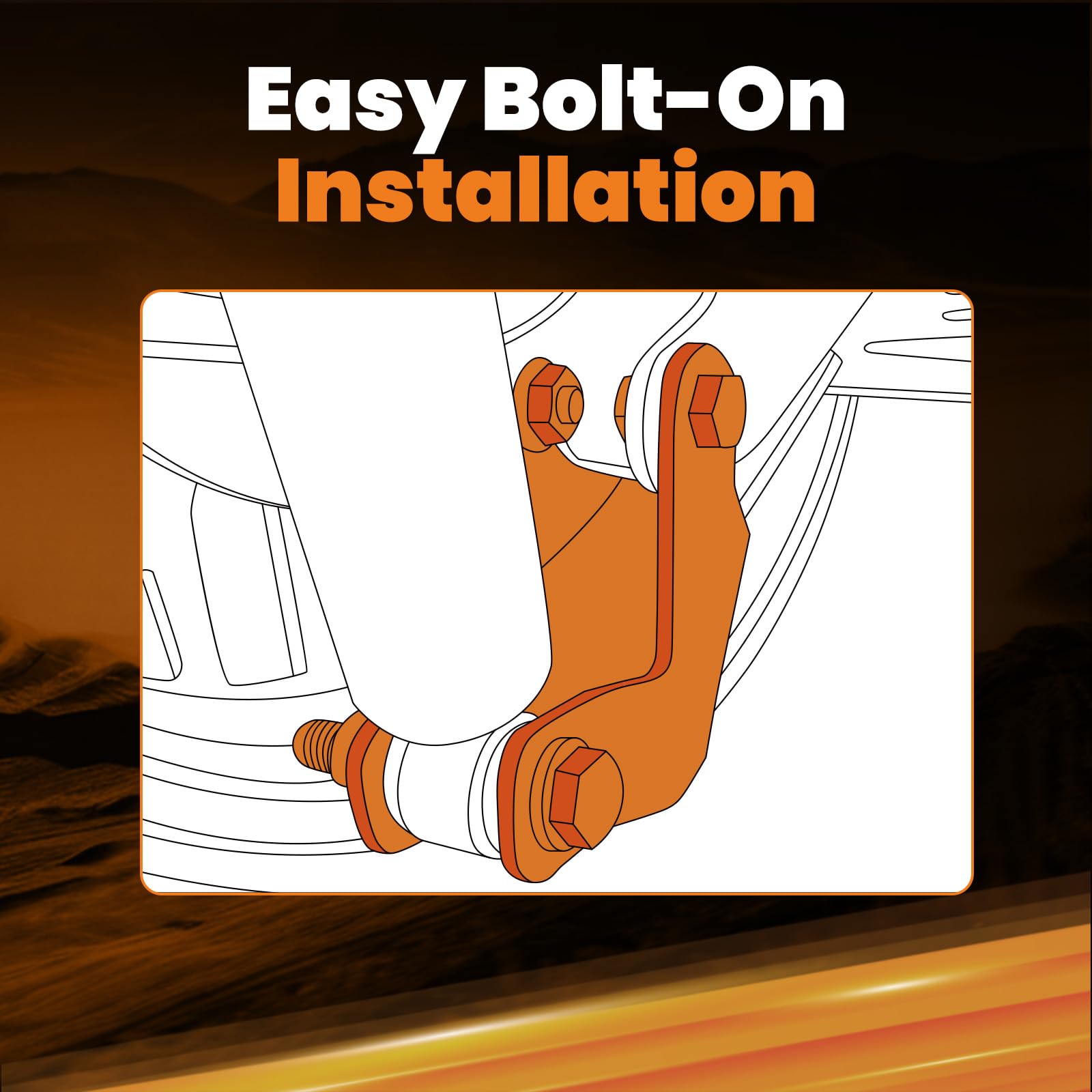 - TOP QUALITY & DURABLE- Drop shock extenders are laser cut carbon steel, undergone powder coating and extensive testing to ensure a direct fit, and long service life. Comes with 2 shock extender brackets, 6 bolts (M12x1.5x45)